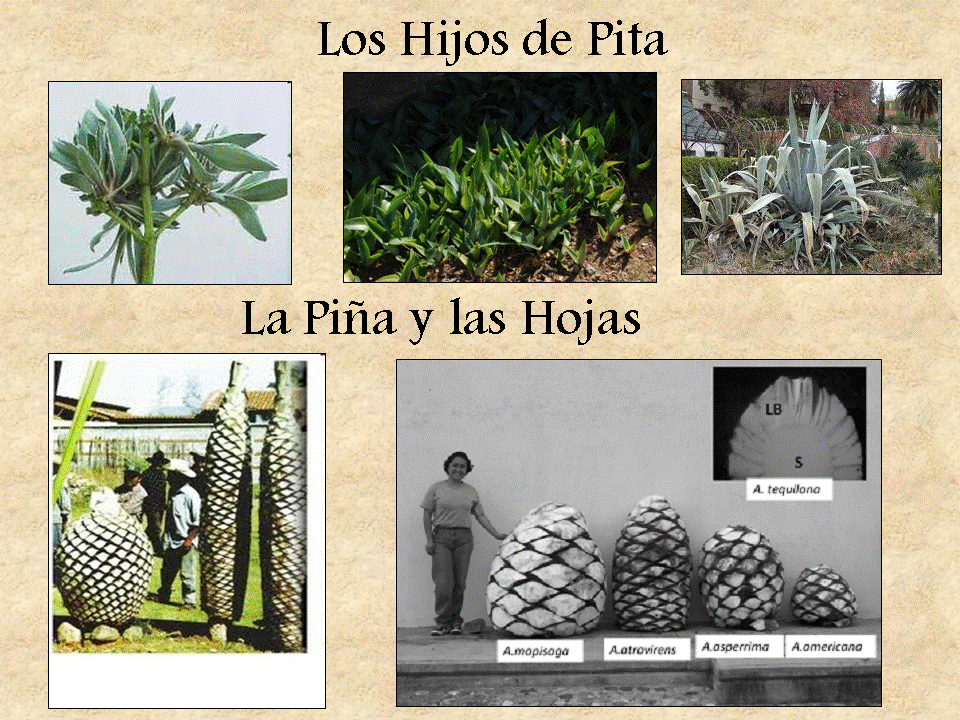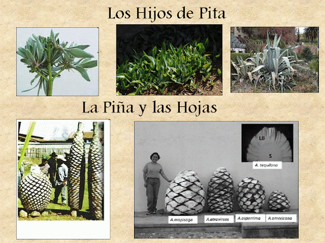 piña, hojas e inflorescencia asadas, así como las semillas y las flores. Se